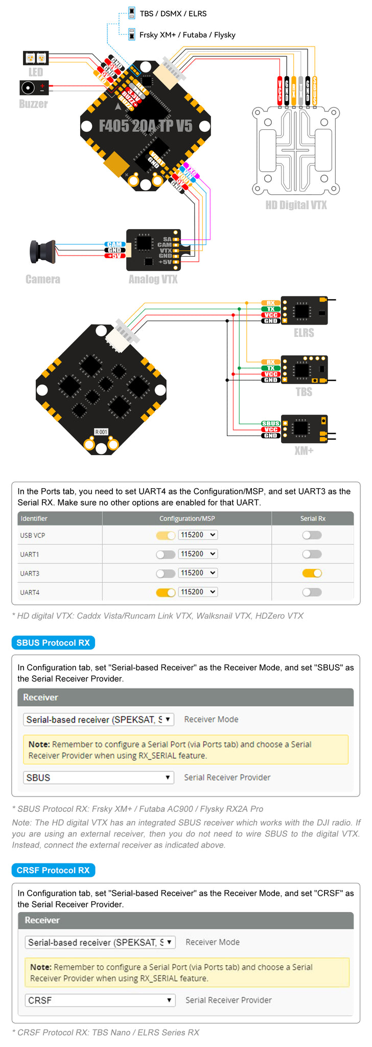 F405 4S 20A FC V5 integrates the Plug & Play port for the external RX and HD digital VTX, and there will be a 4-pin connector for RX and a 6-pin connector for HD digital VTX in the package. Thus, we highly recommend pilots use the port to save the solder work.